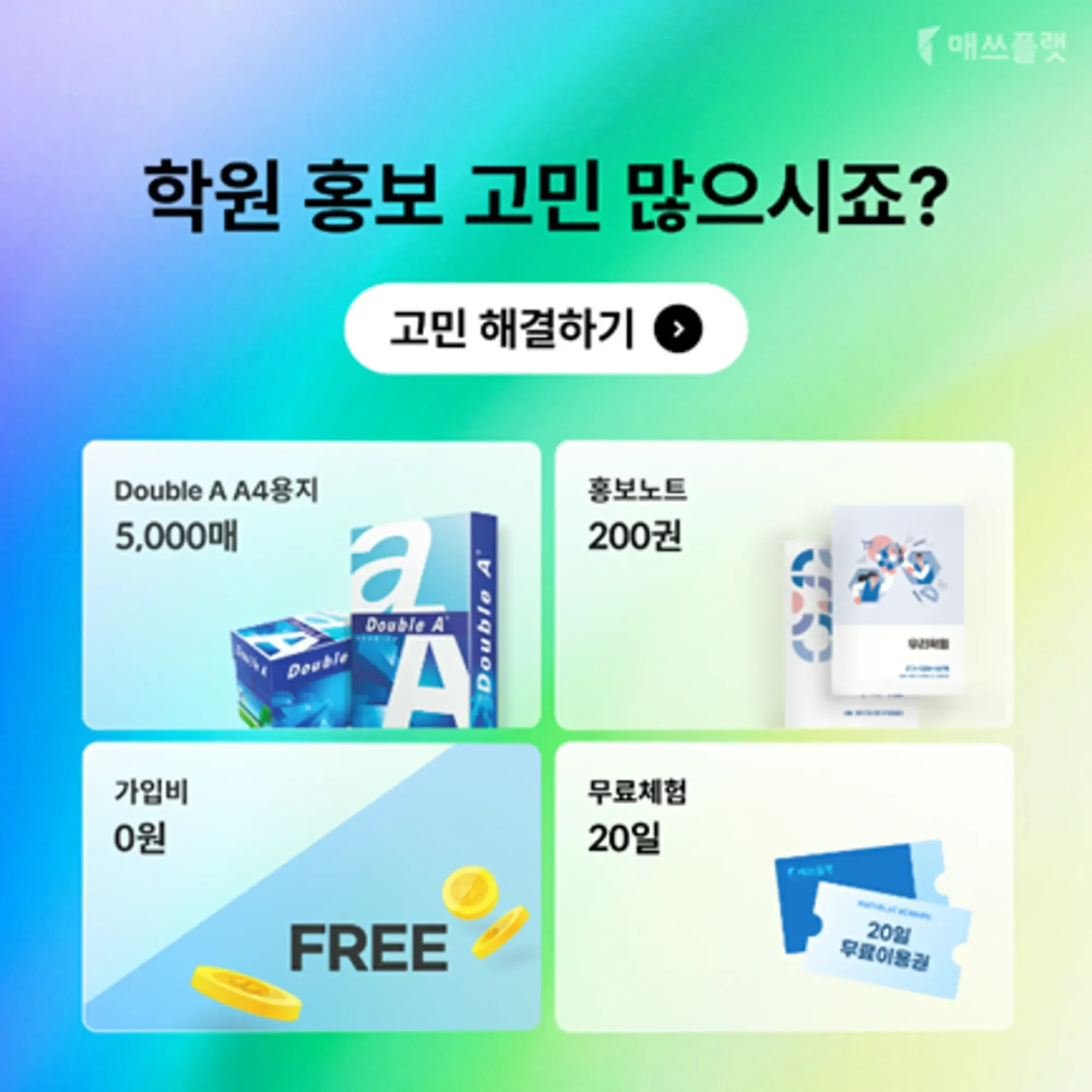 기존보다 조금 더 긴 체험 기간과 홍보 노트 200권, 학습지 출력물 등에 쓰이는 A4 용지를 제공했어요. 선생님의 고민, 매쓰플랫도 함께 고민하겠습니다.