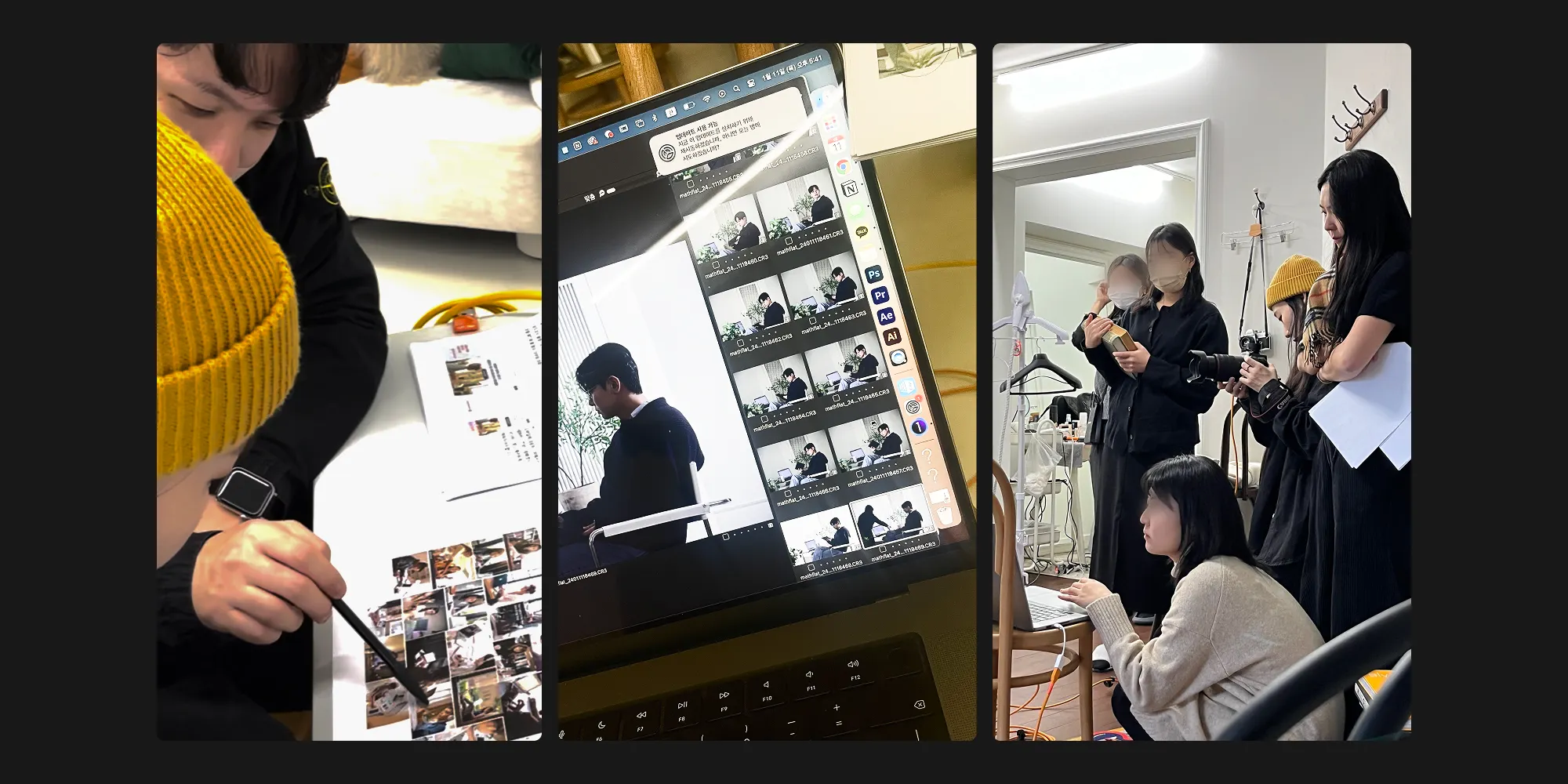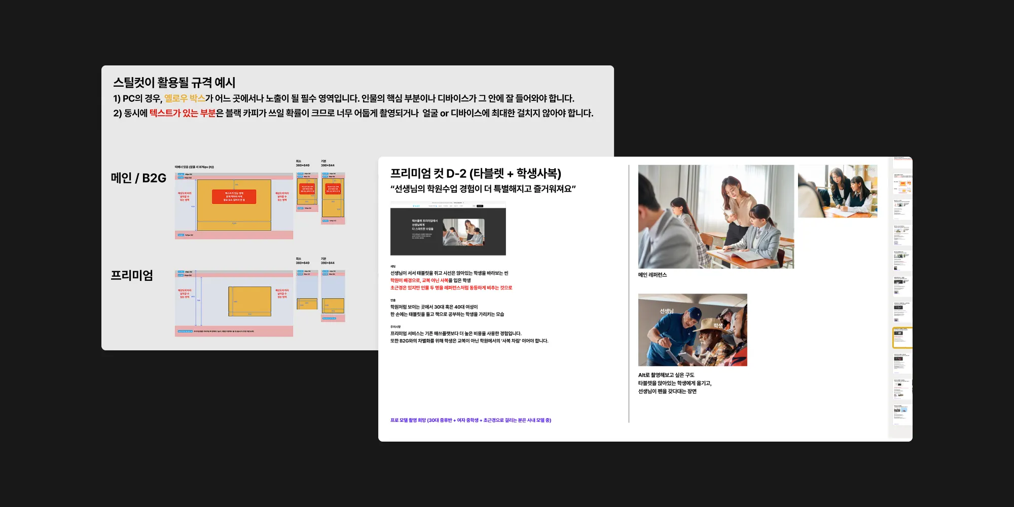 웹, 태블릿, 모바일, 프로모션 등 복잡하고 다양한 레이아웃에 차질 없이 인물을 담기 위해 즉시 작은 팀이 꾸려졌다. 프로페셔널한 마케팅팀의 영상 PD 동료분은 에이전시를 수배하고, 적절한 모델을 기용하고, 예산까지 세팅하여 포토그래퍼분과의 디테일한 촬영 준비를 마쳤다. 나는 짧은 촬영 타이밍을 놓치지 않도록 레퍼런스 이미지와 이후 활용 예제 등을 포함한 촬영 가이드를 짜는 보조 역할을 했다. 그리고 촬영 당일이 되어 마케팅팀의 쌤들, 우리 파트의 팀원들, 사내 일일 모델 쌤들, 미술팀, 메이크업팀 분들과 하루간 고된 촬영을 진행해 사진을 얻어낼 수 있었다.