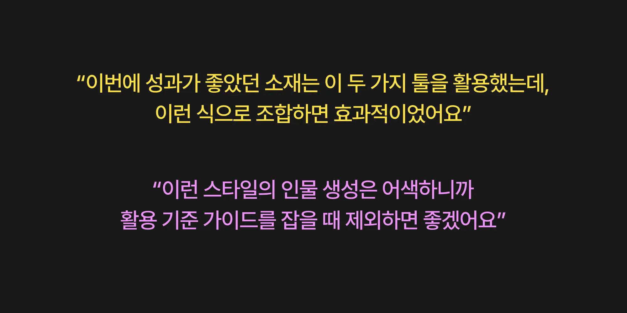 또한 이제 외국어를 쓰는 일이 거의 없던 지금의 업무 환경에서 반 강제적으로 영어를 사용하며 프롬프트 입력이나 설정값에 대한 트레이닝을 계속하게 되었다. 뾰족하고 좋은 크리에이티브가 머릿속에 있다고 해도 입력값이 조악하다면 효율적으로 좋은 결과를 얻기 쉽지 않으며 계속 랜덤한 뭔가에 안주하게 되는 낭비와 악순환이 발생한다. 그래서 특정 프롬프트나 설정값으로 좋은 결과물을 얻었다면, 이후 서로의 작업에 도움이 될 수 있도록 서로 해당 사례를 공유하며 작업하고 있다.