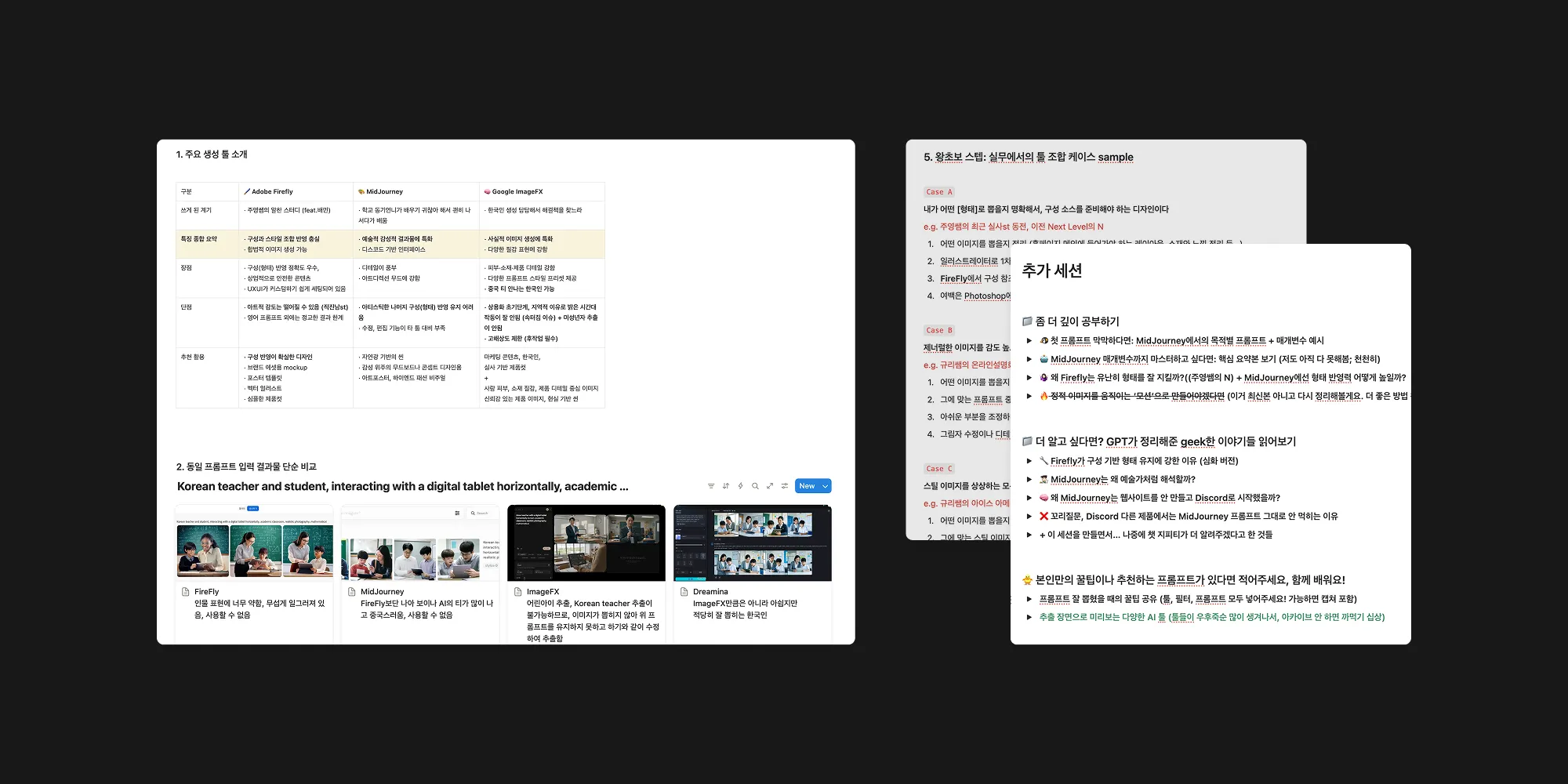 그날 이후 약 2주 동안, 당시 가장 활용도가 높다고 알려진 툴 3-4가지를 추려 집중적으로 테스트했다. 어차피 짧게 잡은 기간이니 주말엔 이런저런 실험으로 시행착오를 미리 겪고, 출근 후 바로바로 현업에 테스트하는 패턴을 가졌다. 그리고 어차피 같이 배워야 실무에 도움이 되니 동시에 팀원들을 대상으로 생성형 이런 AI 도구들을 활용하기 위한 '쁘띠 세션(작고 부담 없는 세미나)'의 준비도 병행하기 시작했다.