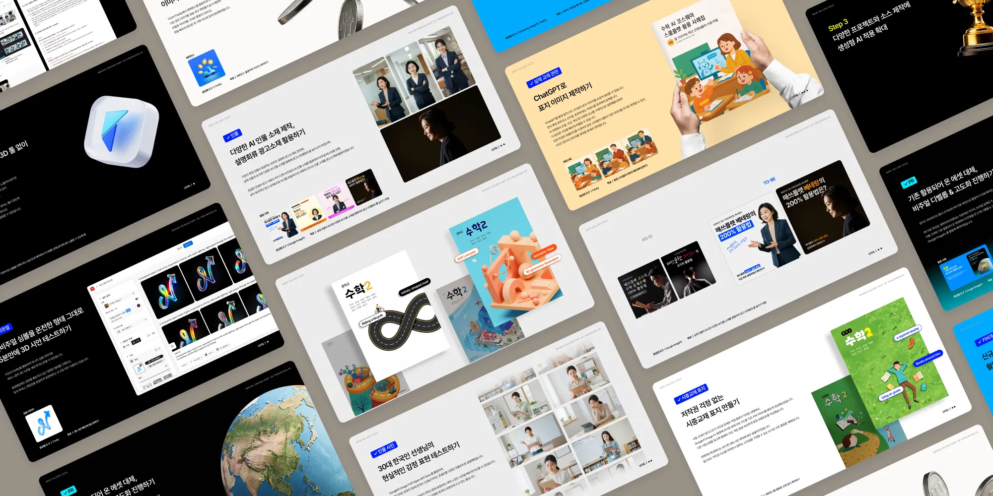 그러나 우리에게 시간은 유한하기 때문에… ‘프리윌린’이라는 기업에 알맞은 브랜드 디자이너의 역할을 따져, 그 안의 ‘매쓰플랫’이라는 제품에 필요한 생성형 AI의 범위를 냉정하게 판단하는 것이 중요하다고 생각했다. 그래서 쏟아지는 기술 중 정신을 차리고 우리가 쭉 데려갈 툴의 선택지를 빠르게 좁혀, 동시에 실무에 던져보며 성과지표를 확인해 보는 것이 가장 적절하다고 결정했던 것 같다.