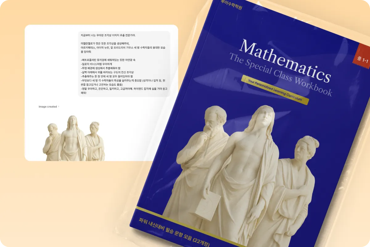 역시 국문으로만 추출한 매쓰플랫 프린팅 표지에 활용된 세 명의 수학자들 이미지. 모델링 없이 ChatGPT를 통해 단시간 내 결과물을 얻을 수 있었다. 한국 초중고 대상의 교재 라인업이지만 누군가는 좀더 학구적이고 어른스러운 표지를 원하는 타깃이 있지 않을까? 확인하고 싶어 해외 워크북 스타일을 시도했고, 놀랍게도 초등학생 타깃에서 선택 비율이 높았다!