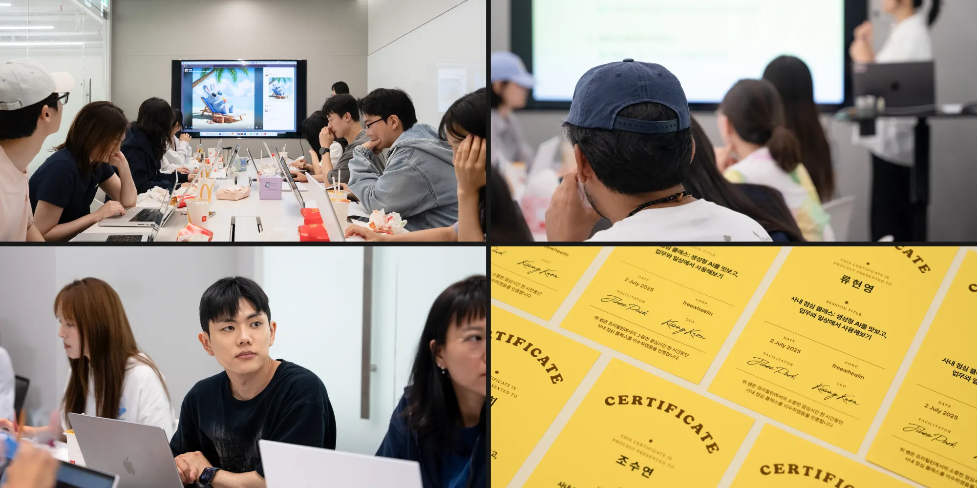 이렇게 새로운 기술들을 잘 배우고 활용하던 중, 프리윌린 피플팀에서 점심 세션으로 우리 파트원을 한 번 스카웃 해준 일도 있었다. 허들이 낮은 생성형 AI툴을 기반으로 다양한 직무의 구성원분들이 기초적인 세미나를 듣고 활용해 보는 시간을 제안주신 것이다. 짧은 세션 후 각 실무자분들은 현업과 일상에 돌아가 모두 다르게 활용하겠지만, 하나의 지식이나 스킬이 더해진다면 나비효과처럼 본인의 업무를 더 에너제틱하게 만들 수 있다고 생각한다.