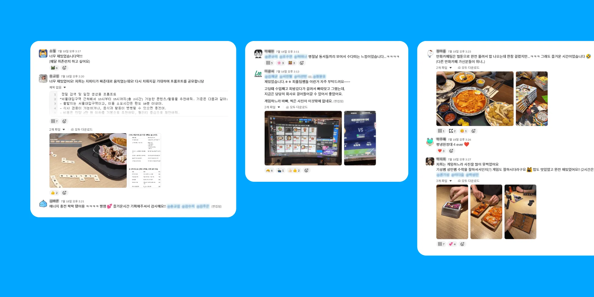 예: 보드게임, PC방, 만화 카페, 탁구, 평양냉면 원정대 등