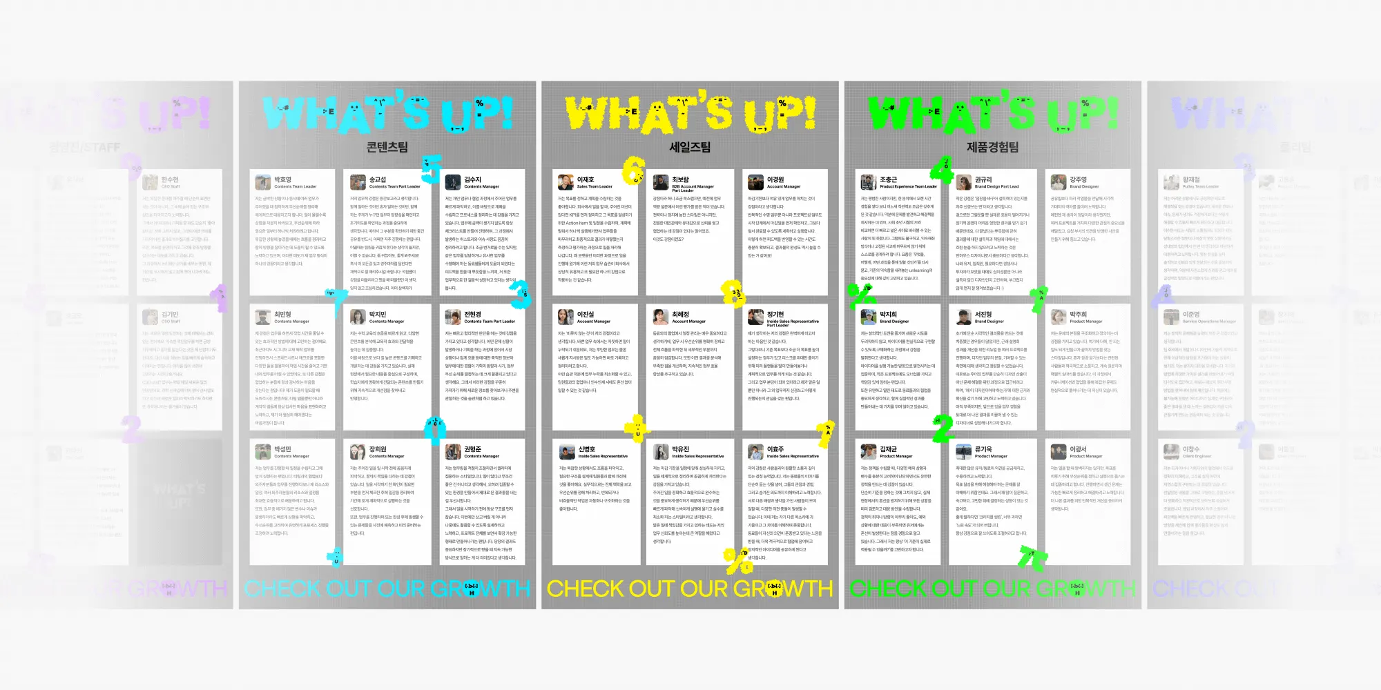 프리윌린에는 구성원들의 업무 성향과 기억에 남는 프로젝트를 공유하는 ‘What’s up?’이라는 문화 프로젝트가 있어요. 반기마다 전 직원이 직접 글을 작성하고, 이를 DID를 통해 소개하며 서로의 일을 이해하는 데 큰 도움을 주는 콘텐츠였죠.