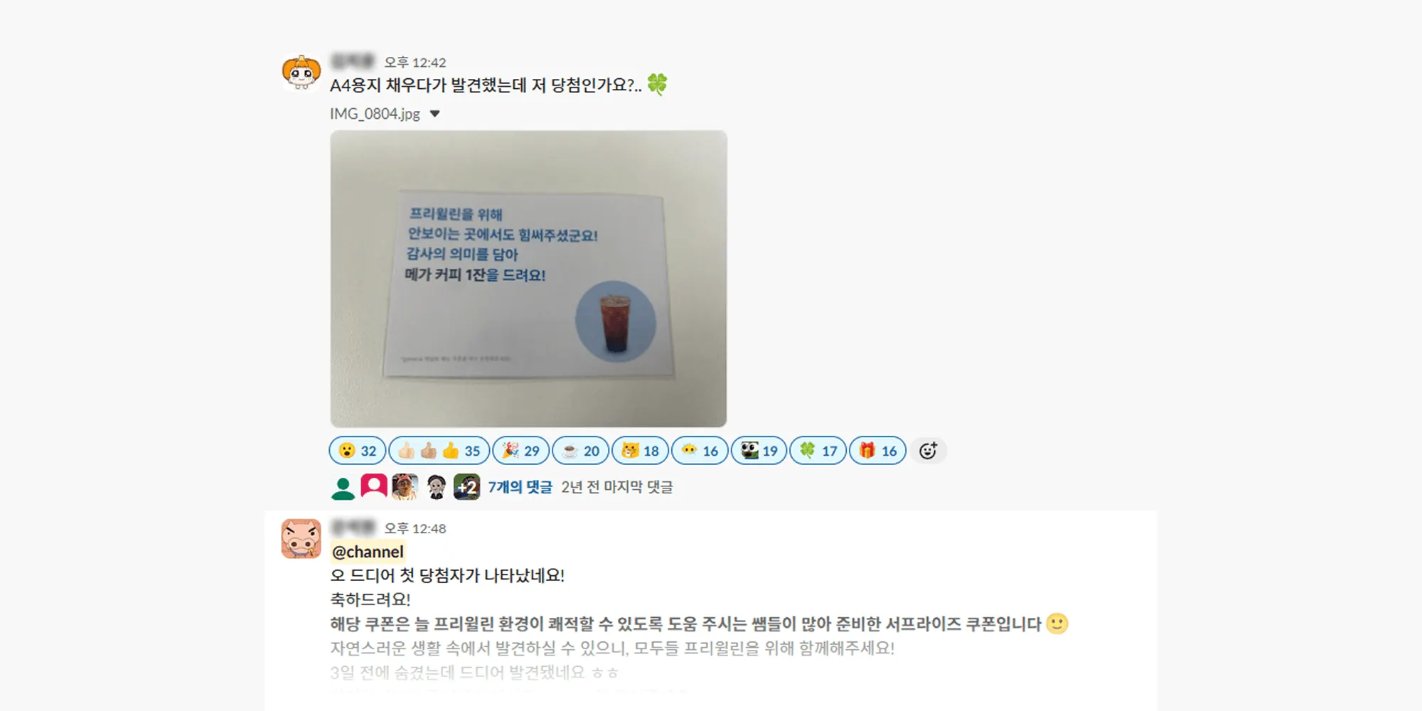 사무실 비품이 비었을 때, 누가 시키지 않아도 조용히 채워주던 분들이 있었어요. 피플팀은 이 배려가 그저 사라지는 선행으로 남지 않길 바랐고, 더 많은 구성원이 이 작은 친절에 동참하면 좋겠다는 생각을 했습니다. 그래서 선택한 방법은 바로 비품을 채우는 곳들에 랜덤 쿠폰을 숨기는 것이었어요. 그리고 그 쿠폰을 회사 전체 채널에 인증하면 커피를 보내드리기로 했어요.