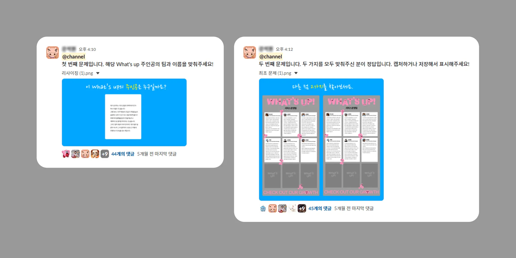 하지만 인원이 50명에서 100명 이상으로 늘어나며, 카드 수가 많아지고 콘텐츠 분량도 커지다 보니 모두가 꼼꼼히 읽기엔 점점 부담스러워지는 상황이 생겼습니다. 그래서 우리는 ‘What’s up’의 의미를 다시 살리기 위해, 참여를 유도하는 새로운 방식을 고민했고 결국 슬랙 퀴즈쇼라는 넛지를 시도하게 되었어요.