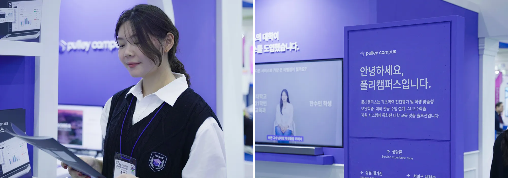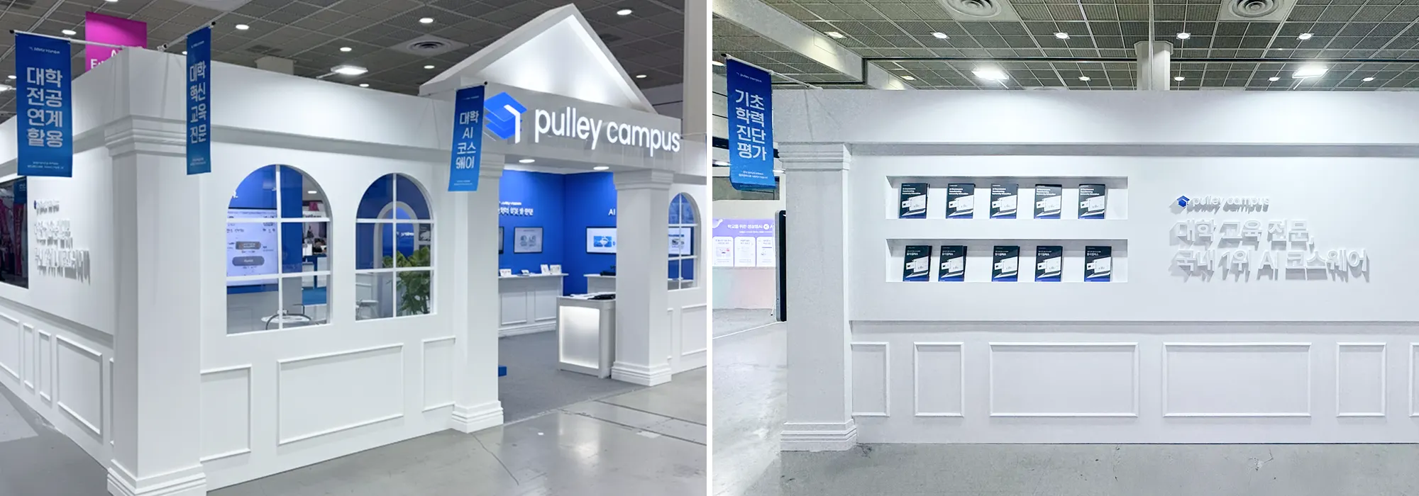 덕분에 멀리서도 부스가 단번에 눈에 띄었고, '풀리캠퍼스'의 서비스 특성에 맞게 실제 캠퍼스 건물 같은 분위기가 자연스럽게 전해지도록 설계했습니다. 기둥과 벽의 몰딩, 아치형 창문 디테일은 물론, 조명의 방향부터 유니폼 제작까지 하나하나 꼼꼼히 신경을 썼습니다. 이런 차별화된 완성도 덕분에 부스를 찾은 많은 관람객들이 "여기 부스만 유독 눈에 띈다", "다른 곳과 다르게 부스가 정말 예쁘다"라는 평가를 해주셨고, 그런 말씀을 들을 때마다 정말 뿌듯했습니다.