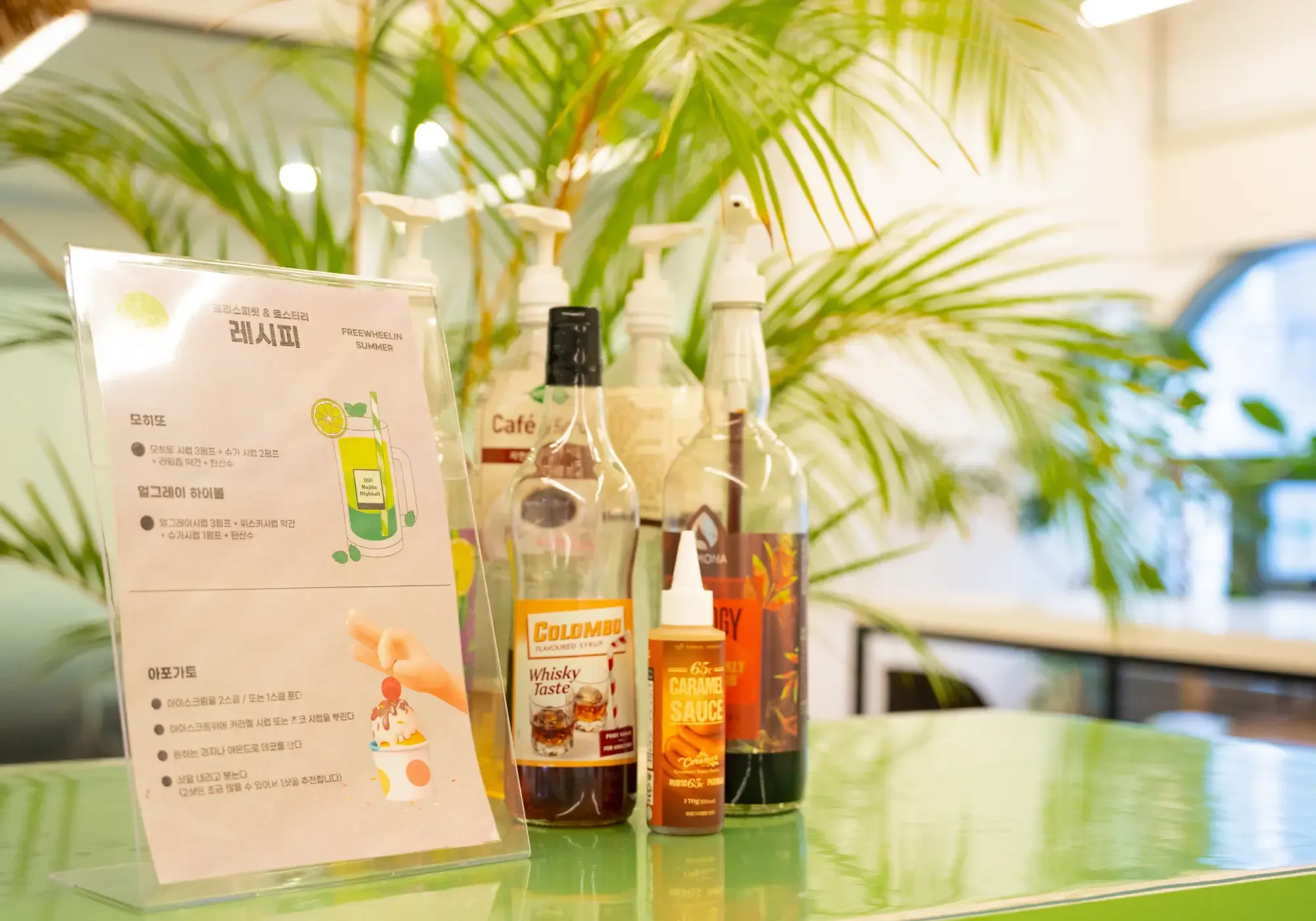 팝업이 끝났다고 해서 힘들게 만든 펍을 그냥 놔둘 수는 없죠! 각 프리팸에게 이번 팝업 음료의 레시피를 받아 재료와 함께 구비해두었어요.