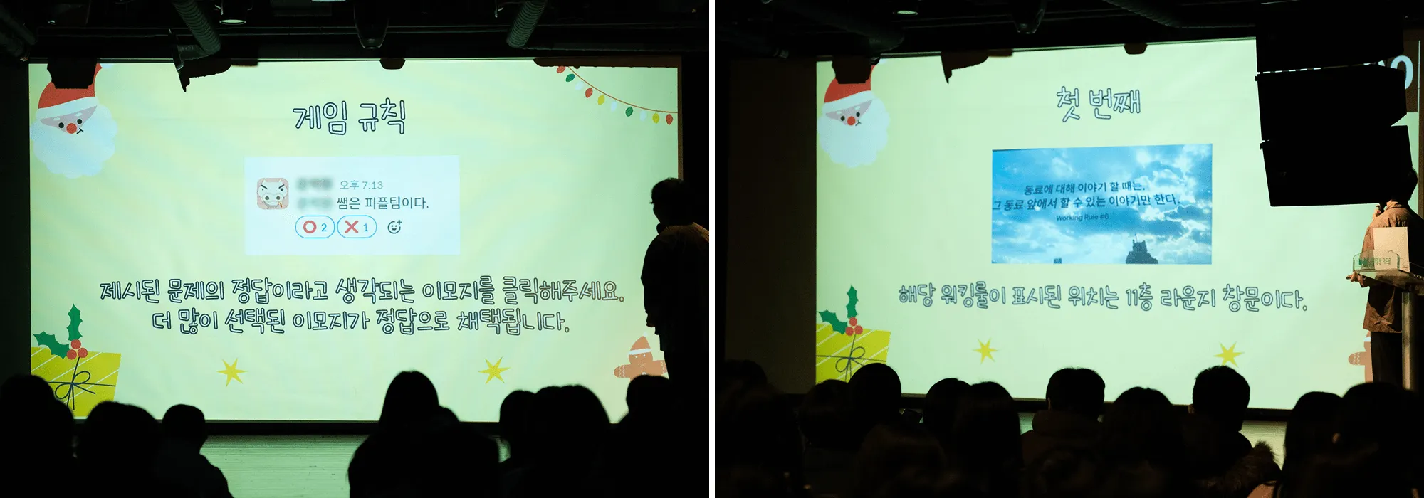 또한, 앞에 나와 참여하는 게임 위주의 구성에는 한계도 분명했어요. 공간 규모상 많은 인원이 동시에 즐기기 어려웠고, 지난 5년간 팀을 나누거나 대표자를 뽑아 진행하던 방식은 일부 구성원에게 적지 않은 부담으로 남아 있었습니다. 실제로 이번 행사 준비 과정에서도 “랜덤으로 뽑혀서 나가야 하는 게임이 있나요?”라는 질문이 나올 정도였어요. 그래서 이번에는 ‘희망자만 참여하는 무대’라는 원칙을 세웠고, 그 부담을 완전히 내려놓을 수 있는 장치로 복면가왕을 선택했습니다.