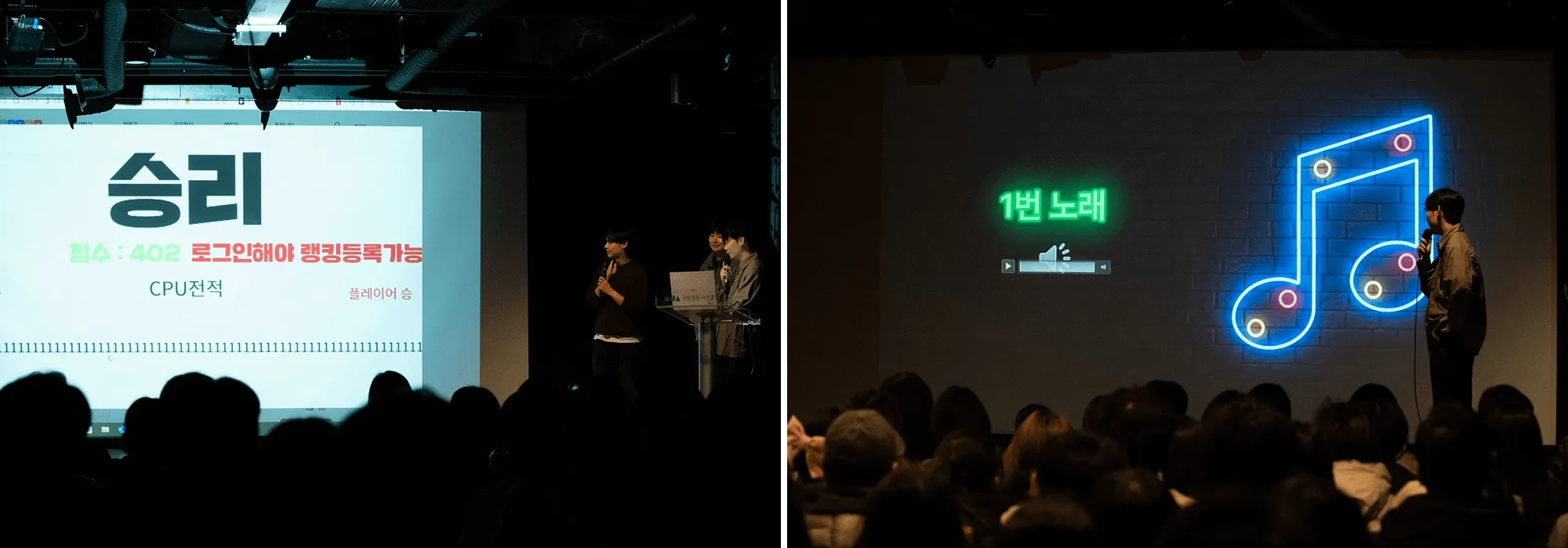 다만 무대가 계속 이어지면 집중도가 떨어질 수 있기에, 무대 사이사이에 짧은 미니 게임을 준비했습니다. 첫 세 무대가 끝난 뒤에는 분위기를 환기시키는 장치로 ‘AI를 이겨라’를 진행했어요. 이번 중간 게임을 준비하며 가장 중요하게 생각한 기준은 ‘부담이 없을 것’이었습니다. 무대에 올라 몸을 쓰거나, 사람들 앞에서 나서야 하는 게임 대신 단상 위에서 컴퓨터 화면을 보며 참여하거나, 앉은 자리에서 문제를 맞히는 방식으로 구성했어요. 준비한 게임은 다음과 같습니다.