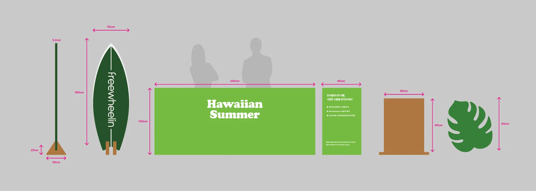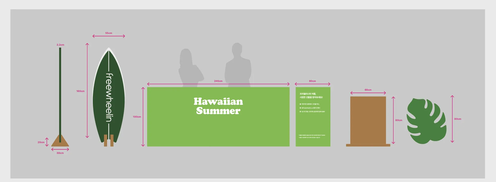 그래서 이번 테마를 ‘Hawaiian Summer’로 정했어요. 새벽부터 서핑을 즐기던 와이키키의 서퍼들이 휴식을 취하던 가판대나 길거리 푸드트럭 등에서 아이디어를 얻어, 바쁜 프리윌리너분들이 잠시나마 하와이 해변 어딘가에서 휴식하는 듯한 공간을 디자인했어요. 또한 친환경 소재인 허니콤보드를 사용해 디자인을 구현하기로 했어요.