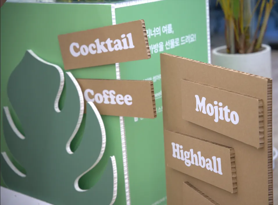 그래서 이번 테마를 ‘Hawaiian Summer’로 설정했어요. 새벽부터 서핑을 즐기던 와이키키의 서퍼들이 휴식을 취하던 가판대, 길거리 푸드트럭 등에서 차용한 홍보물 모티브들을 적용하며 잠시나마 하와이 해변 어딘가에서 휴식을 취할 수 있는 공간을 마련하기 위한 디자인을 진행했어요! 그리고 친환경 소재에 가까운 허니콤보드를 사용해 디자인을 구현하기로 했어요.