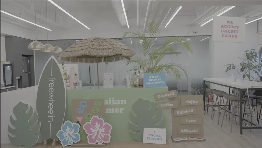 프리윌린은 작년 여름부터 계절에 맞춘 시즌 인테리어를 진행하고 있어요. 이번 여름 인테리어를 기획하며 '여름이 주는 이미지가 무엇일까?'를 고민했는데, 직장인에게 여름은 휴가 시즌이라는 생각이 들었어요. 그래서 회사에 출근해도 휴양지에 온 것 같은 느낌을 주기로 했습니다.